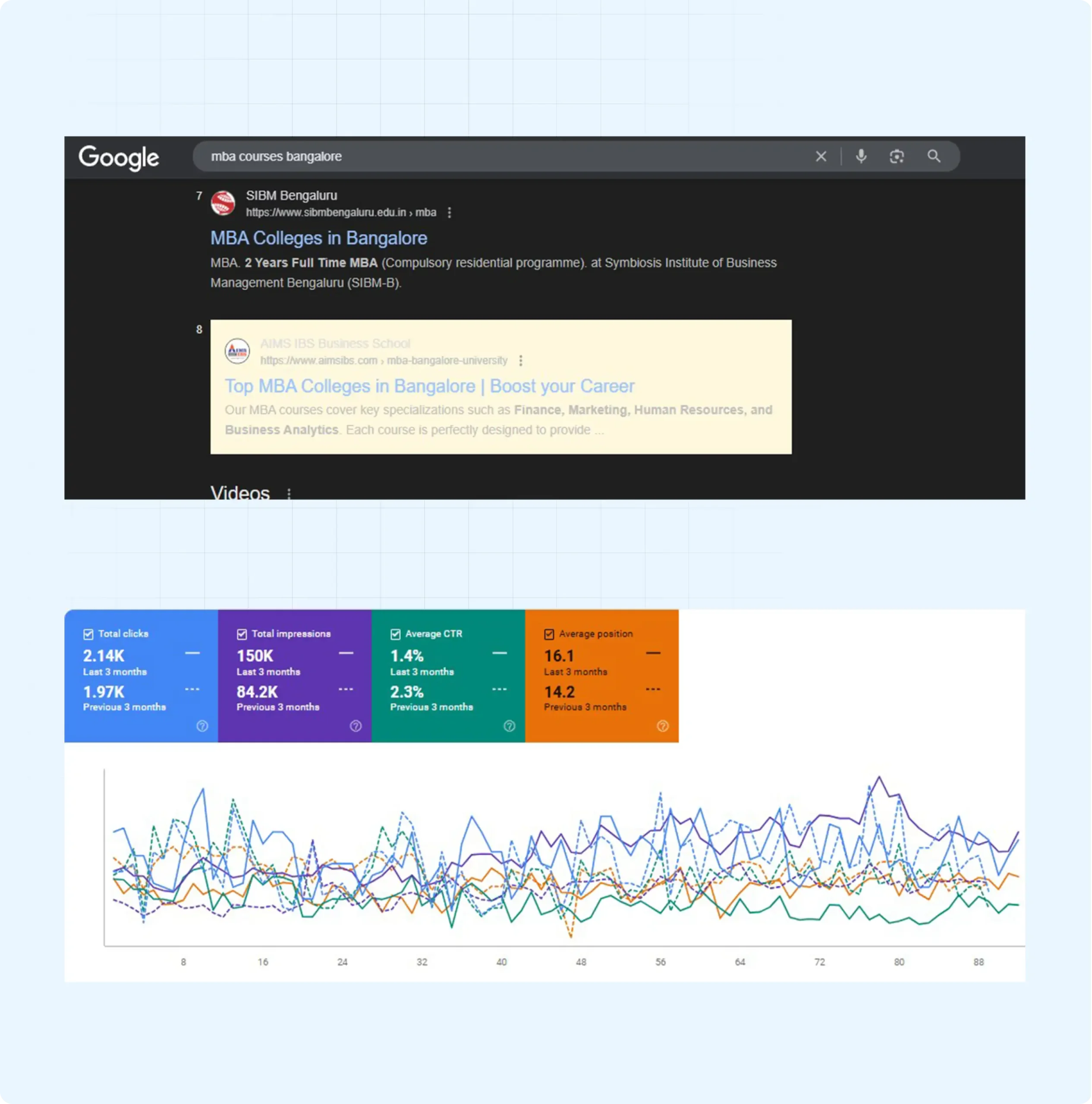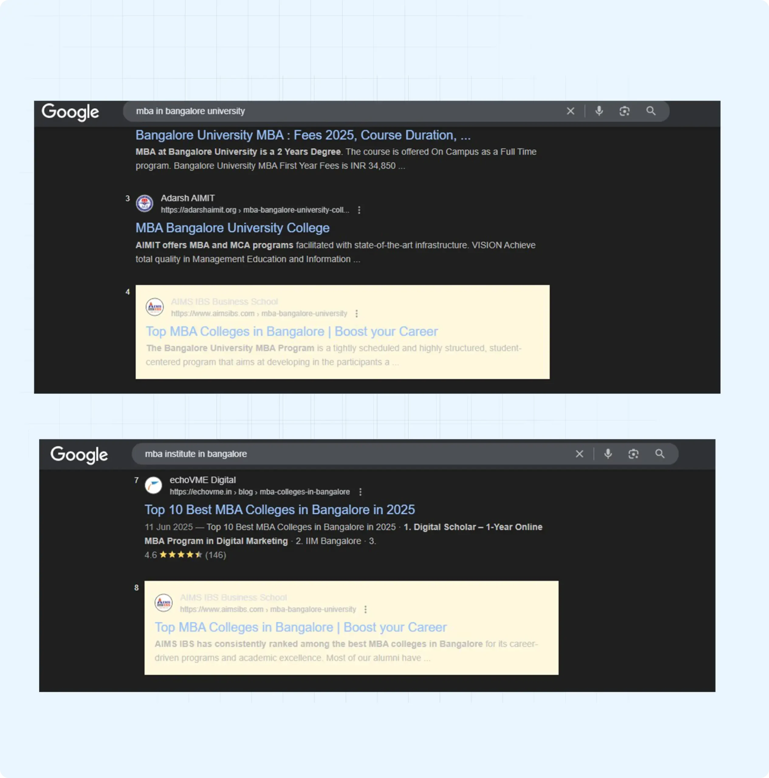 Optimized web content with Bangalore-specific keywords, backed by technical enhancements, to secure first-page rankings for targeted courses.