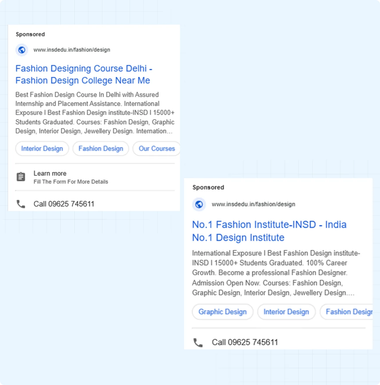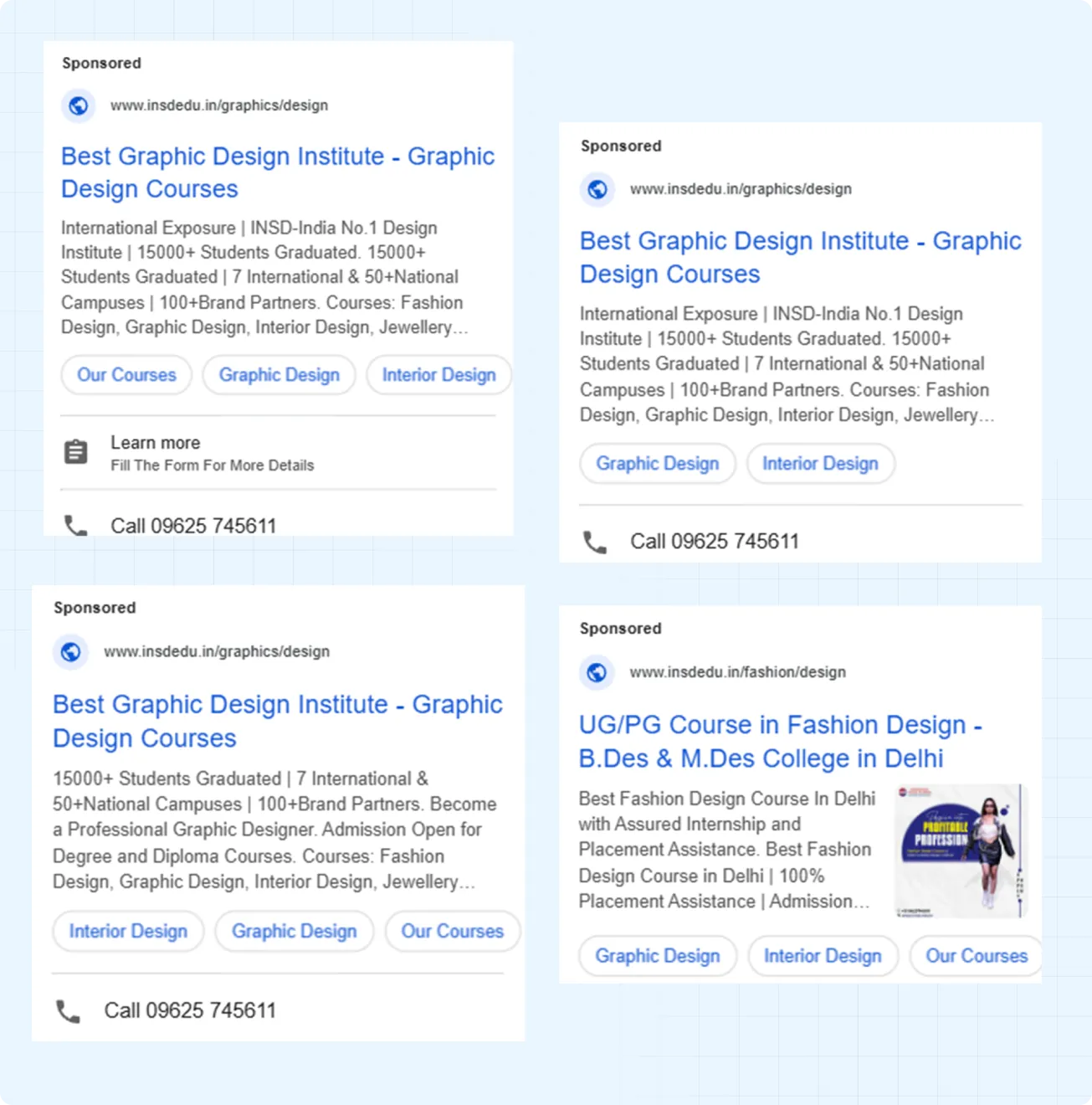 We launched high-intent search campaigns targeting queries like best fashion design course or graphic design institute near me. This ensured INSD appeared right when students were actively exploring options, driving high-quality leads at scale.